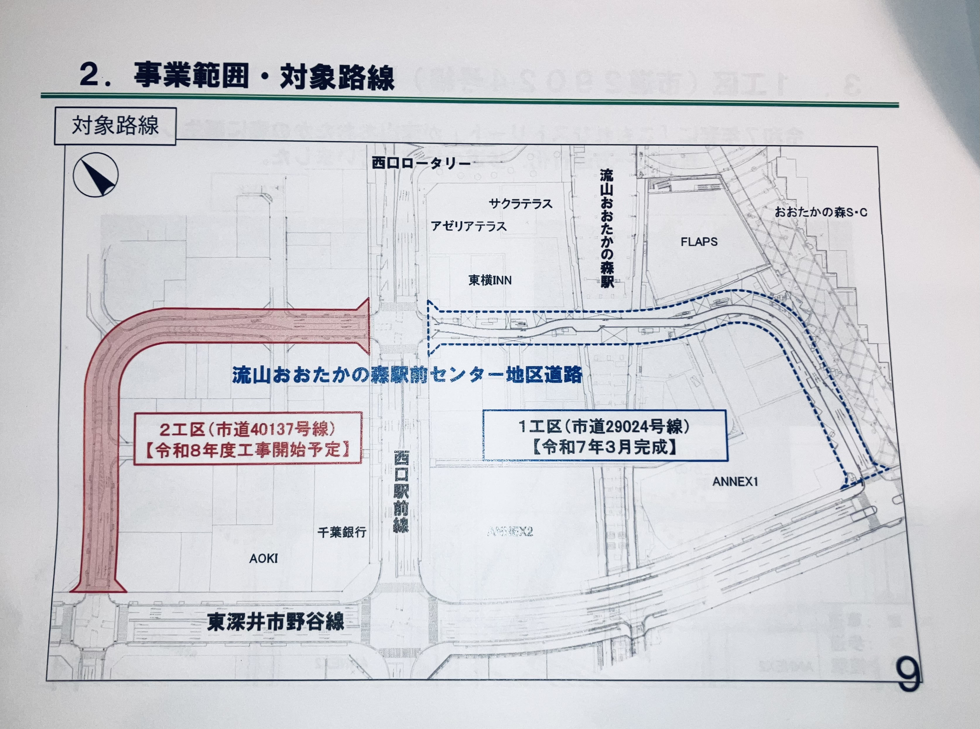 流山おおたかの森駅周辺の「Annex(交番裏あたり)からCOTOE辺りまでの道路」と行った方がわかりやすいかもしれない。この道路について、これを改変する事業。